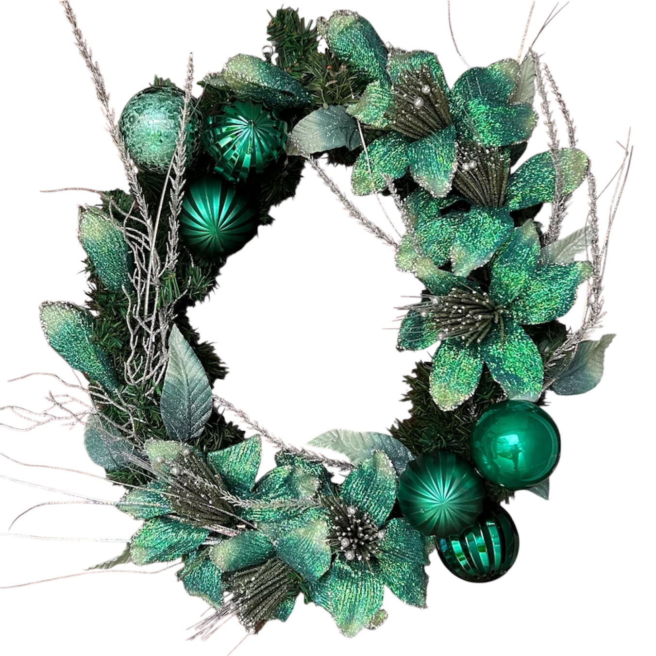 Com flores glitterizadas e bolas decorativas, ela transforma qualquer ambiente com elegância e frescor .