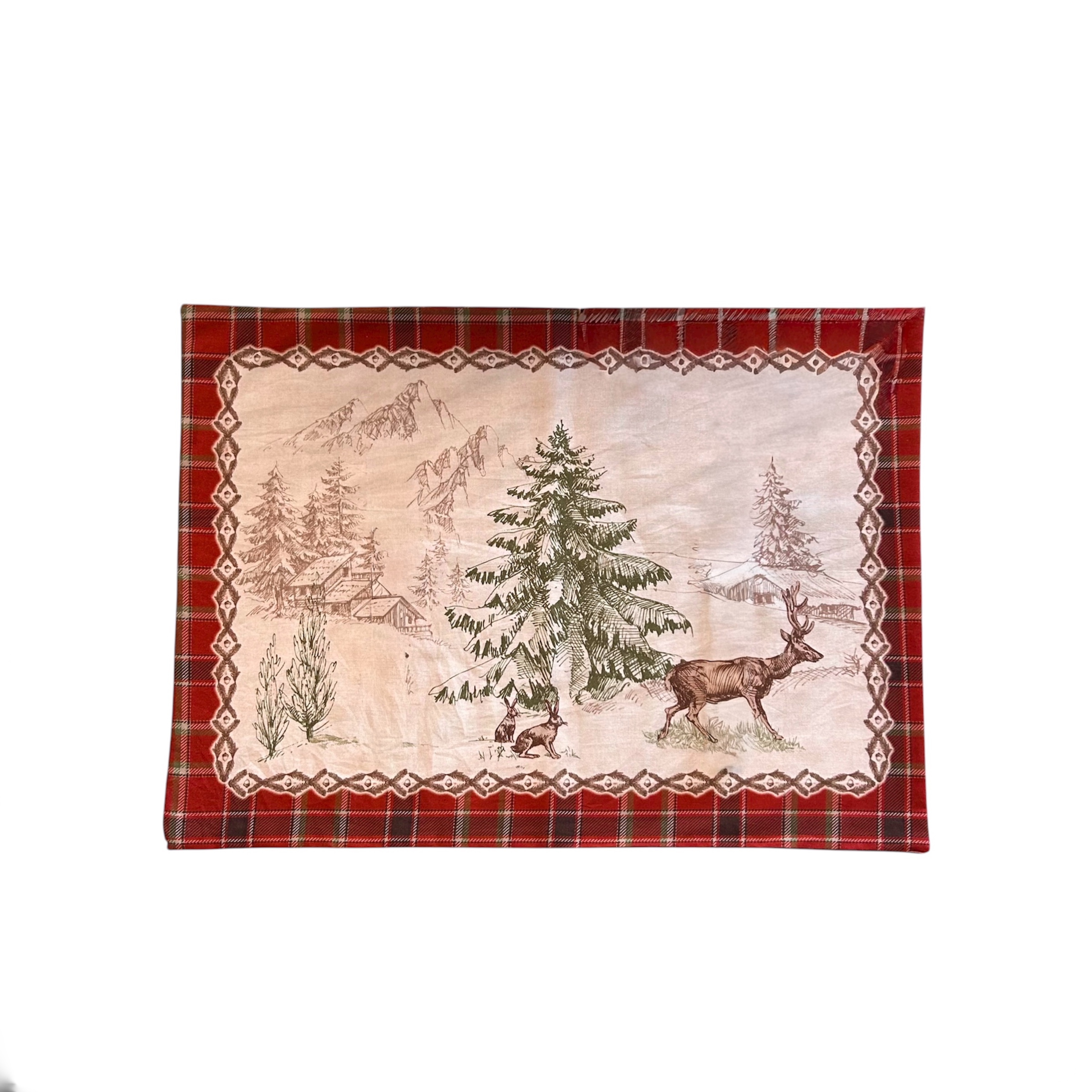 O Lugar Americano Natalino Maison Amis Decor ,traz o encanto do inverno para sua mesa .Com estampa delicada de pinheiros e cervos em tons neutros,ele é finalizado com a borda xadrez vermelha que adiciona um toque clássico e acolhedor a decoração.